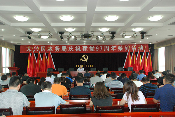 为深入学习贯彻习近平新时代中国特色社会主义思想和党的十九大精神,7月19日下午,大兴区水务局召开纪念建党97周年系列活动大会,组织全系统111名共产党员重温了入党誓词,开展了书记讲党课、“三农”特色宣讲进机关,参观了光大水务天堂河再生水厂,教育引导党员时刻牢记身份,进一步激励全局各级党组织和广大党员干部有担当、敢作为,积极投身到打造首都南部发展新高地的实践中。
